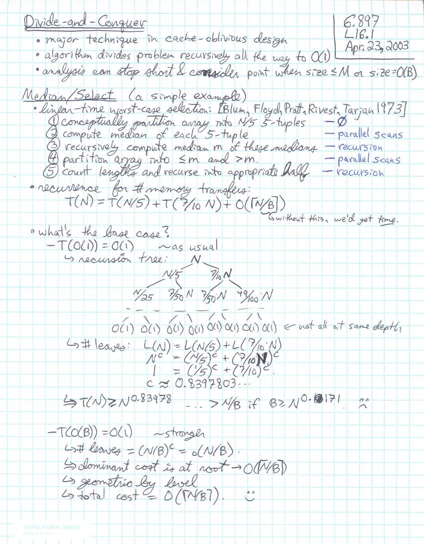Divide-and-conquer, cache-oblivious median/select, cache-oblivious static search trees (binary search), cache-oblivious B-trees, external-memory sorting