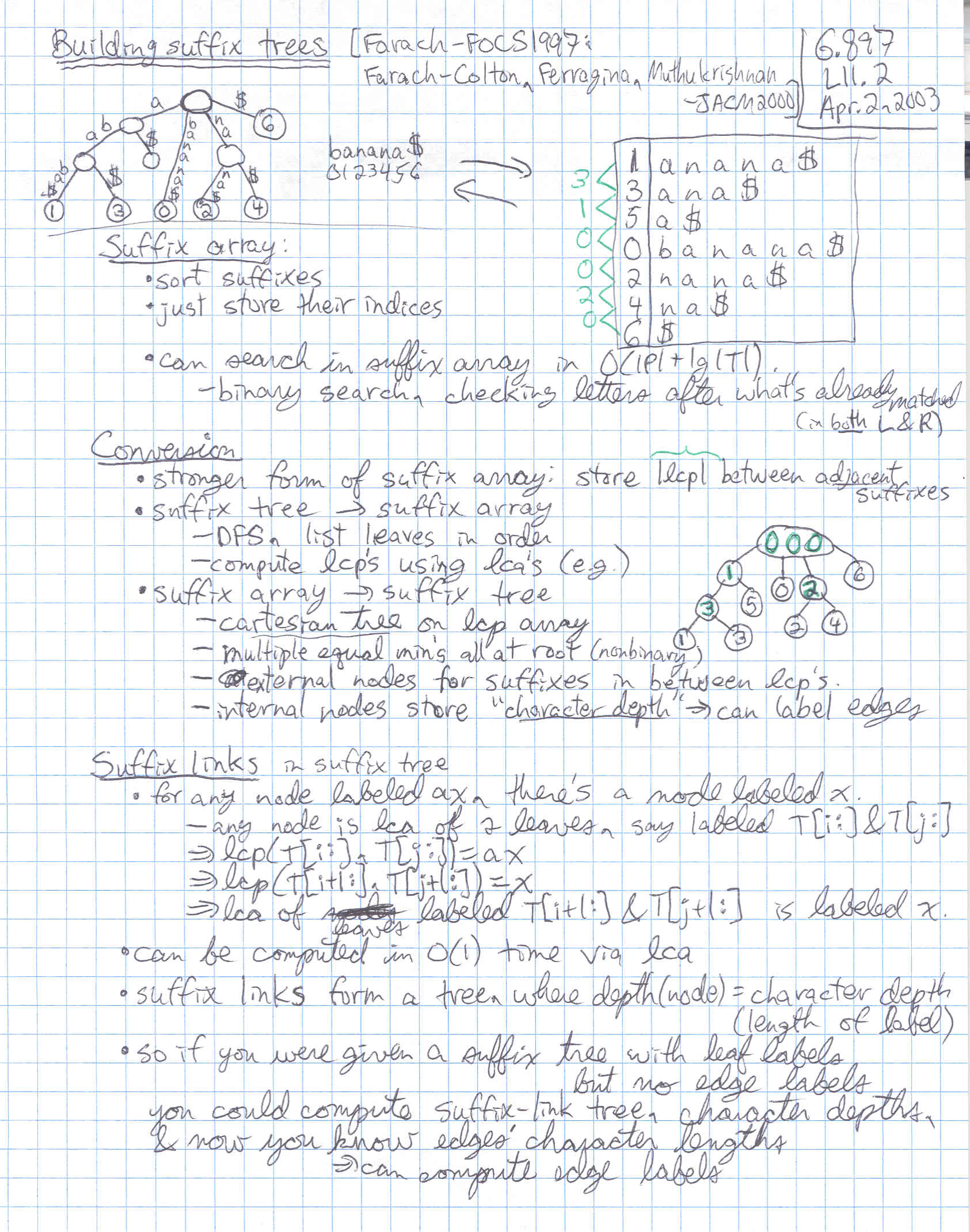 Least common ancestors in constant time; suffix arrays, suffix links, constructing suffix trees in linear time (beyond alphabet sorting)