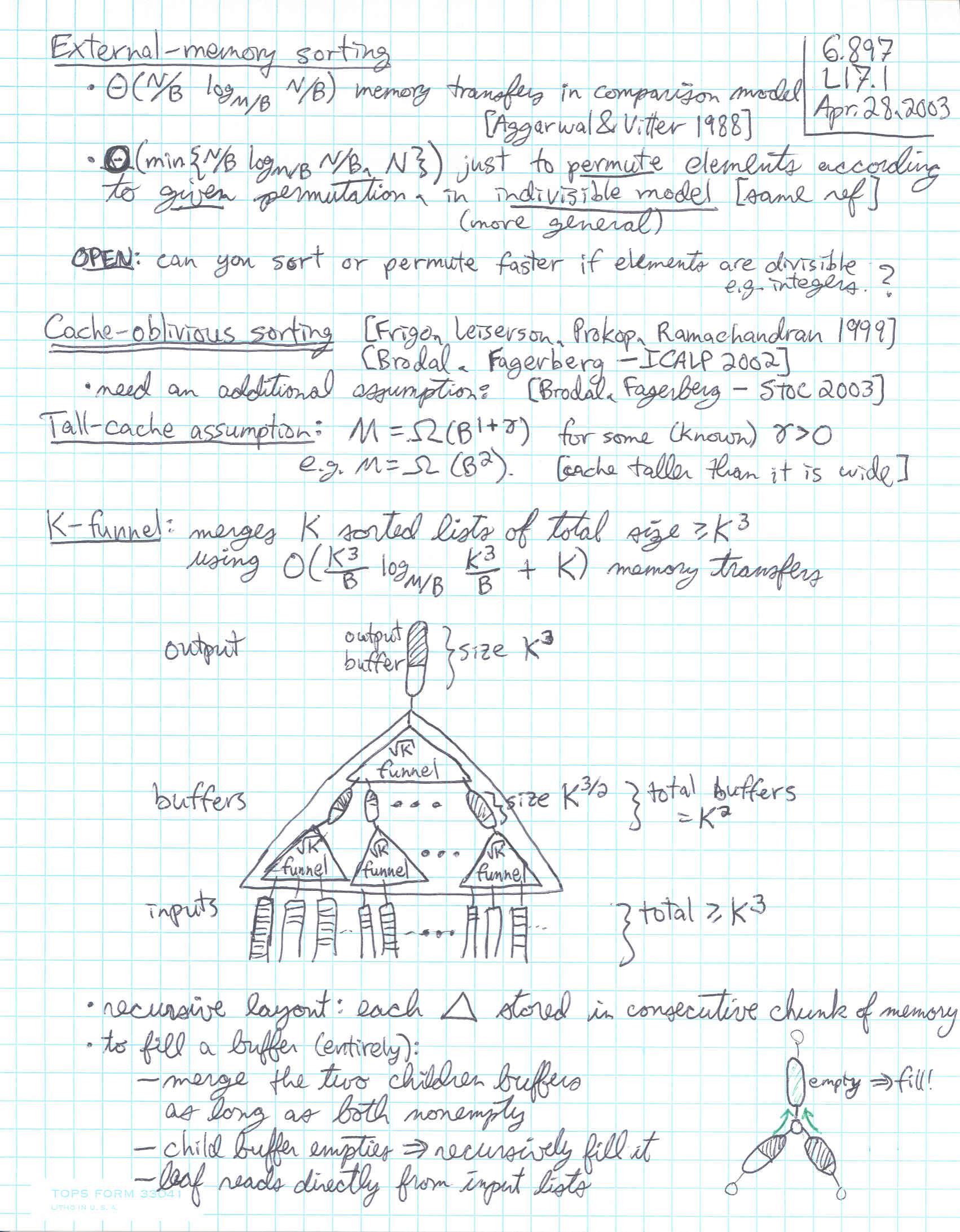 External-memory sorting, cache-oblivious sorting, Funnelsort, cache-oblivious priority queues, Funnelheap