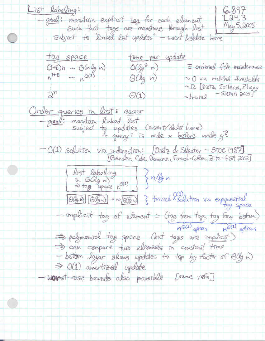 Lecture 24: External memory / cache-oblivious: Ordered file maintenance, list labeing and order queries, cache-oblivious priority queues