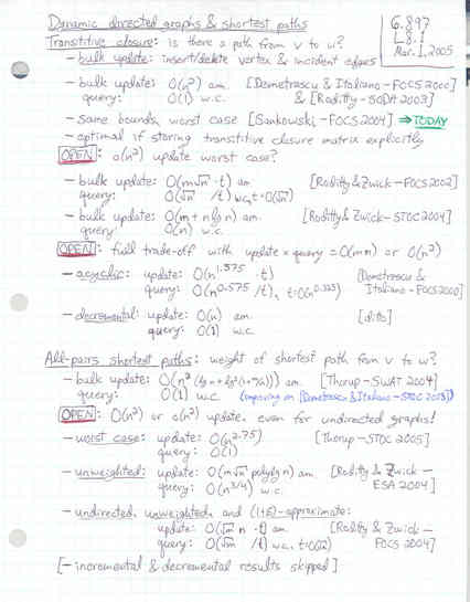Lecture 8: Dynamic graphs: dynamic directed graphs and shortest paths, O(n2) worst-case dynamic transitive closure, dynamic matrices